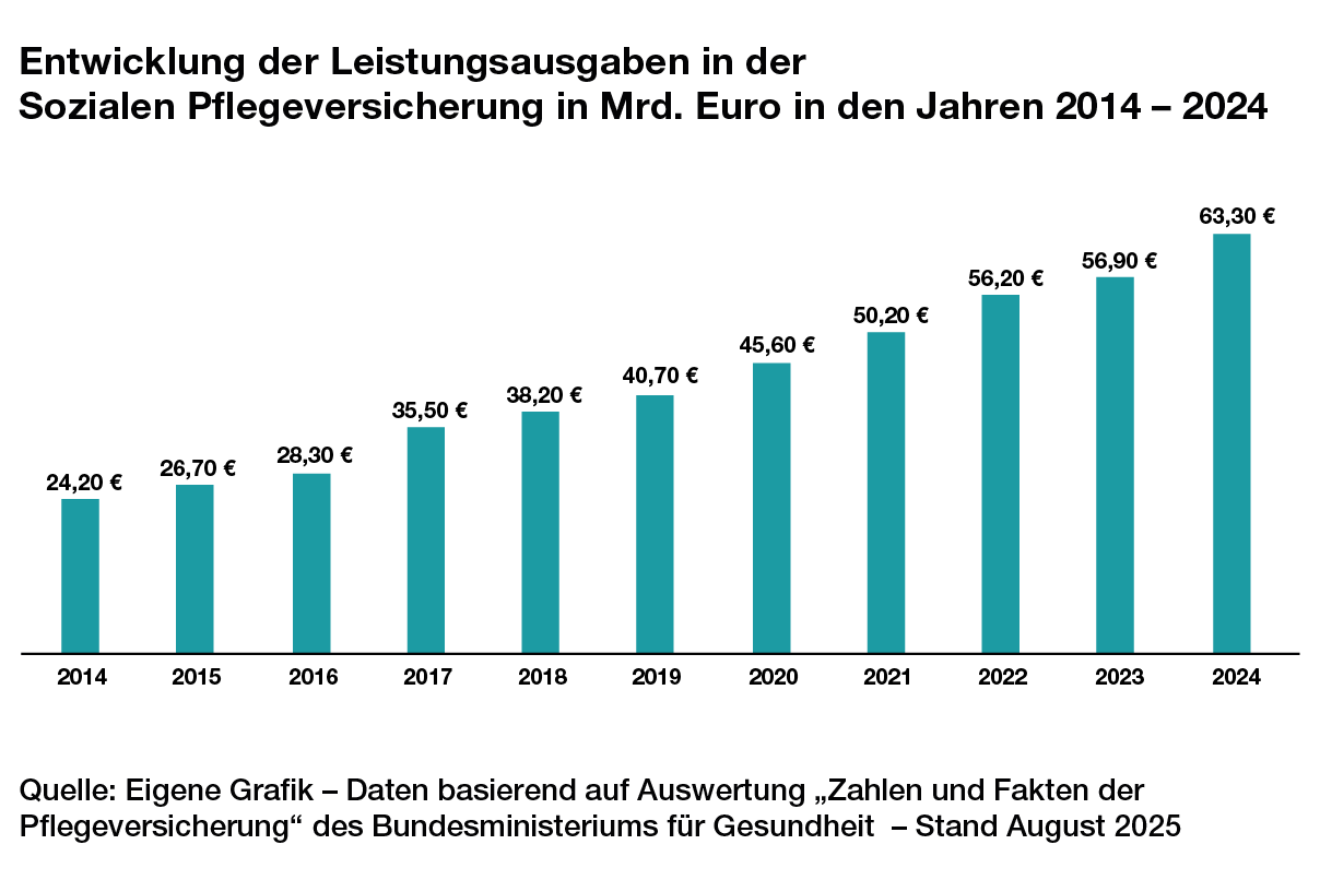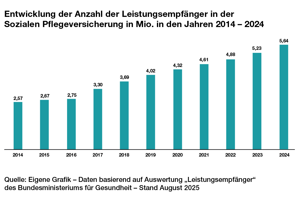 Deutlich mehr Menschen erhalten aufgrund der Pflegereformen Leistungen aus der Pflegeversicherung. Im Jahr 2014 waren ca. 2,6 Mio. Menschen in der Sozialen Pflegeversicherung (SPV) pflegebedürftig. Im Kalenderjahr 2024 empfangen bereits ca. 5,6 Mio. Menschen Pflegeleistungen in der SPV.