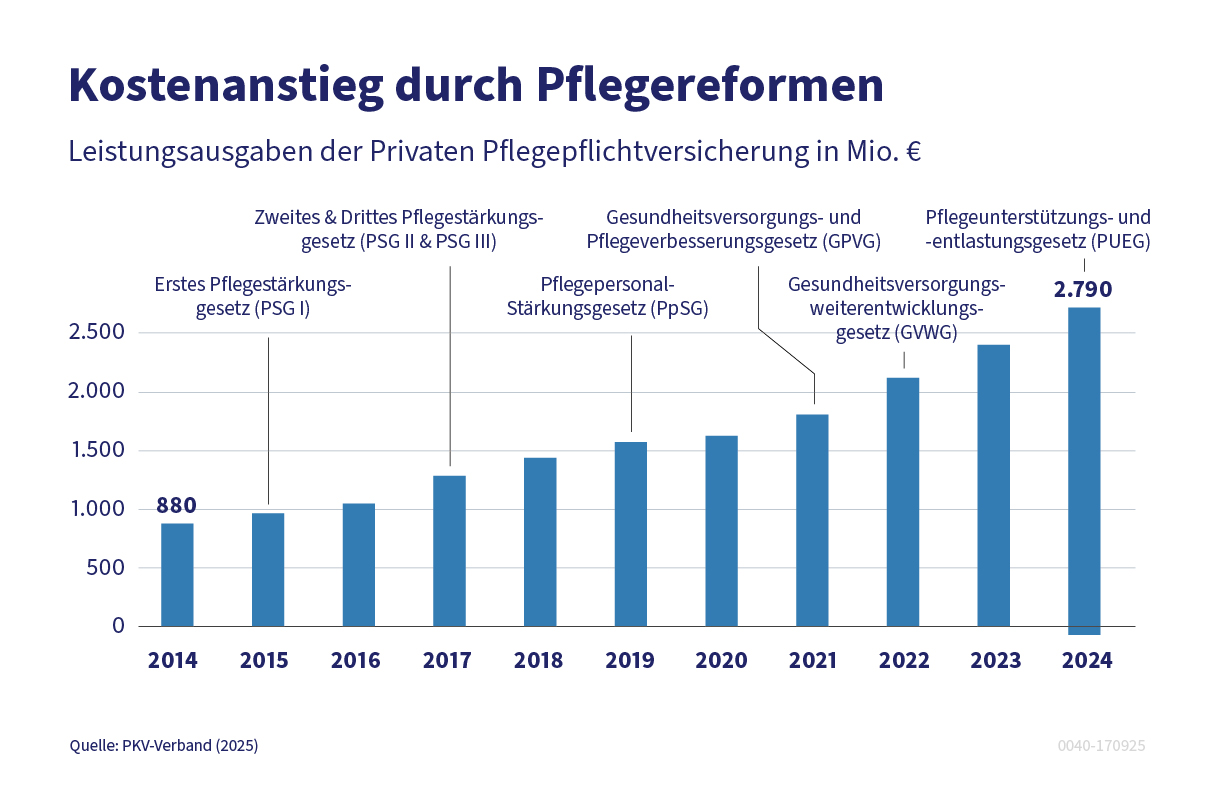 Das liegt vor allem an der stark steigenden Zahl an Empfangsberechtigten. Während 2014 rund 169.000 Personen Leistungen der PPV bezogen, waren es 2024 bereits 379.000 – also mehr als doppelt so viele. Dies ist nach wie vor eine Folgewirkung der Reformgesetzgebung von 2017. Danach werden mehr Versicherte als pflegebedürftig eingestuft. Hinzu kommen unter anderem die stark gestiegenen Zuschüsse zu den Eigenanteilen im Pflegeheim.