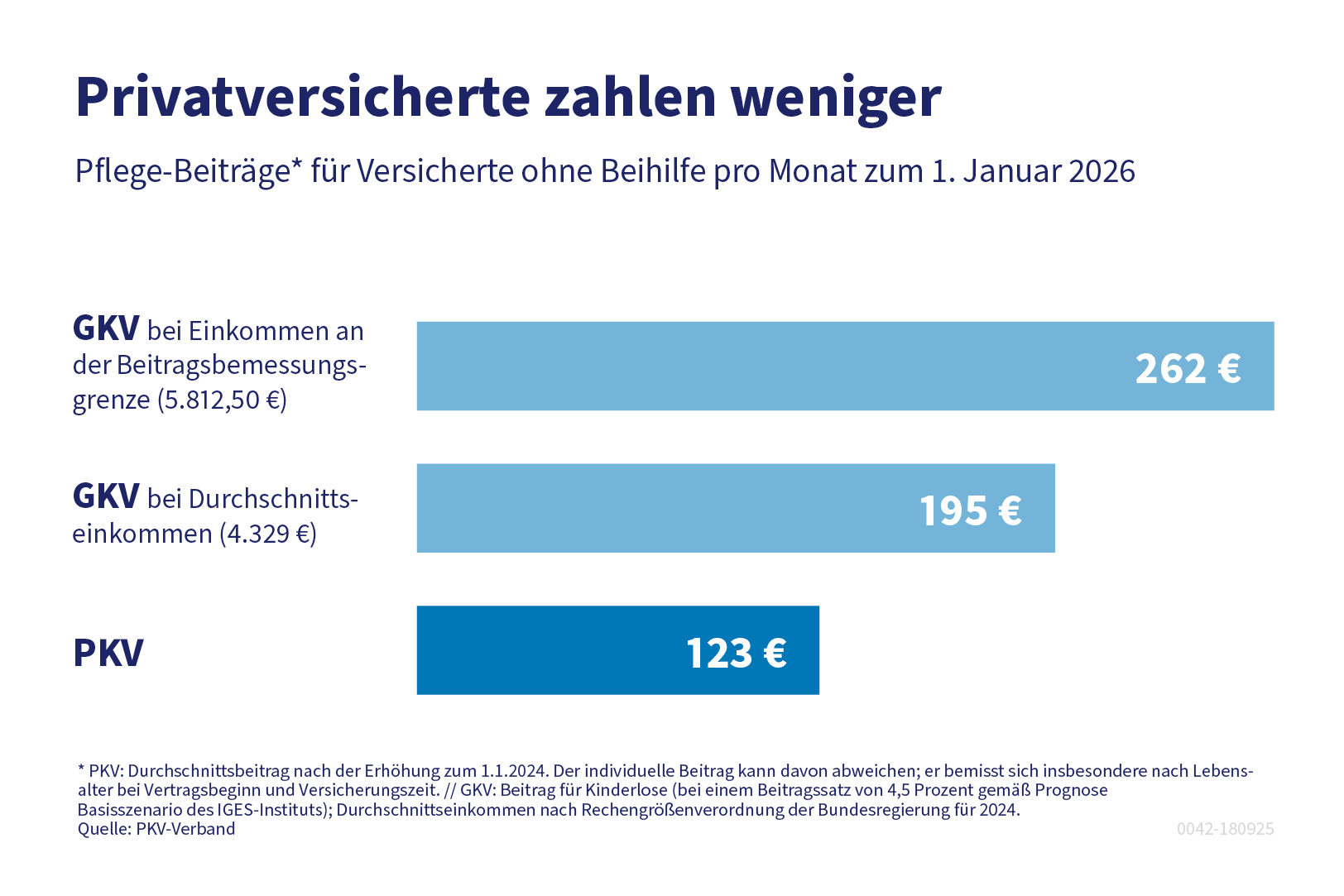 Sollte der Beitragssatz in der SPV wider Erwarten stabil bleiben, müssten kinderlose Angestellte mit einem Verdienst an der Beitragsbemessungsgrenze etwa 244 Euro zahlen und Angestellte mit einem Durchschnittseinkommen rund 182 Euro pro Monat. Privatversicherte zahlen in der Regel deutlich weniger Beiträge für die Private Pflegepflichtversicherung.